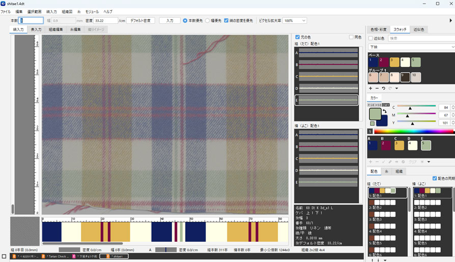 シミュレーション作成においても、実際と同じように糸を準備し、組織を決め、縞割を作成していきます。