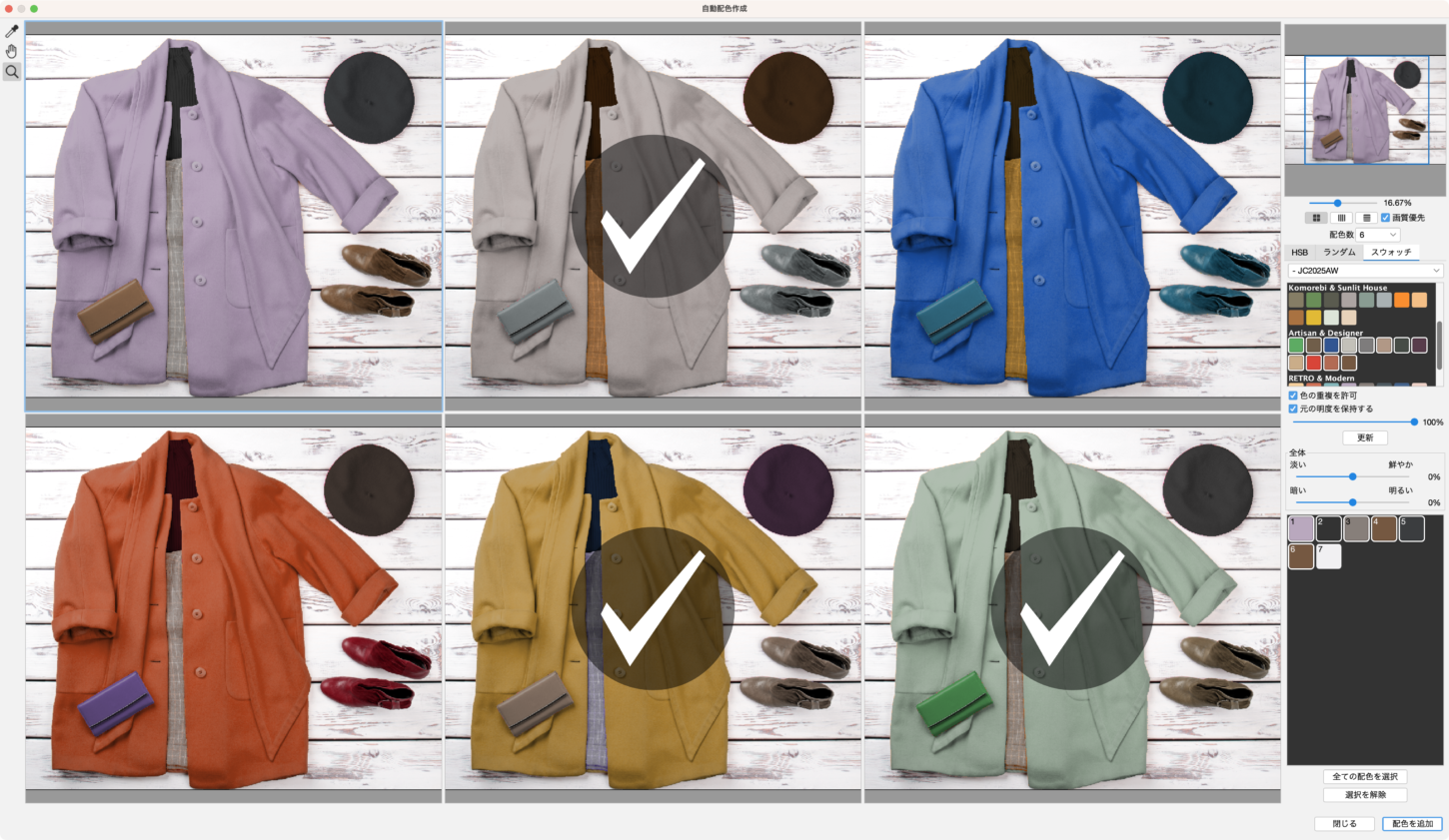 - モジュールメニュー>配色作成 の機能を使って、配色のバリエーションをまとめて展開することも可能です。操作方法は、配色作成を参照してください。