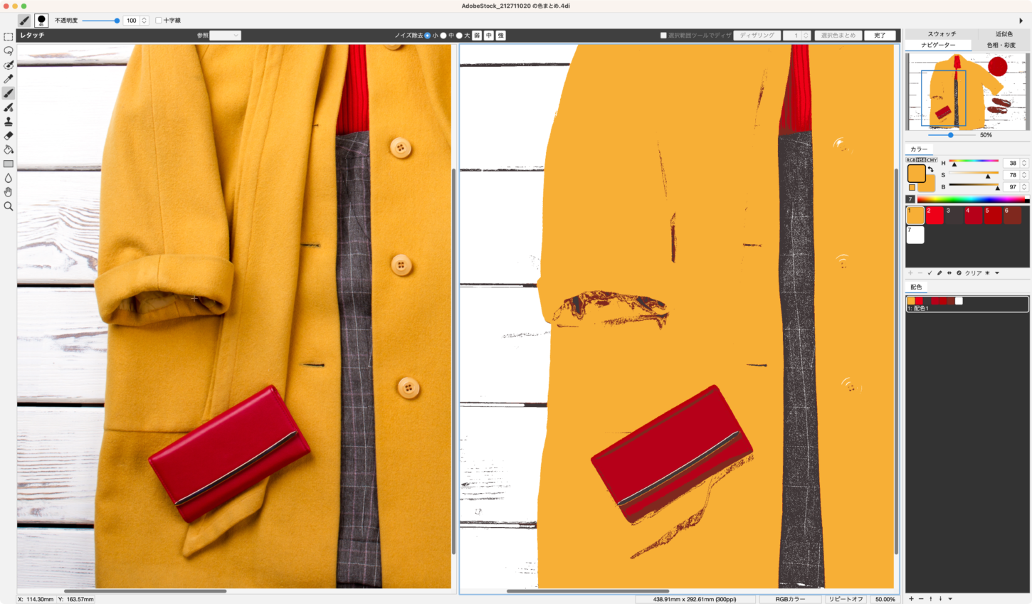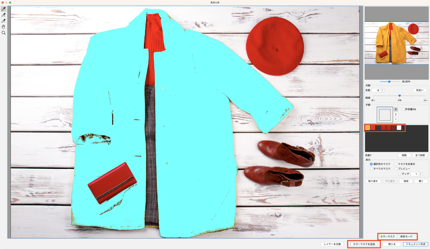 - 最後に「カラーマスクを追加」をクリックします。これで元の画像にカラーマスクが追加され、拾った色がカラーパネルに表示されます。