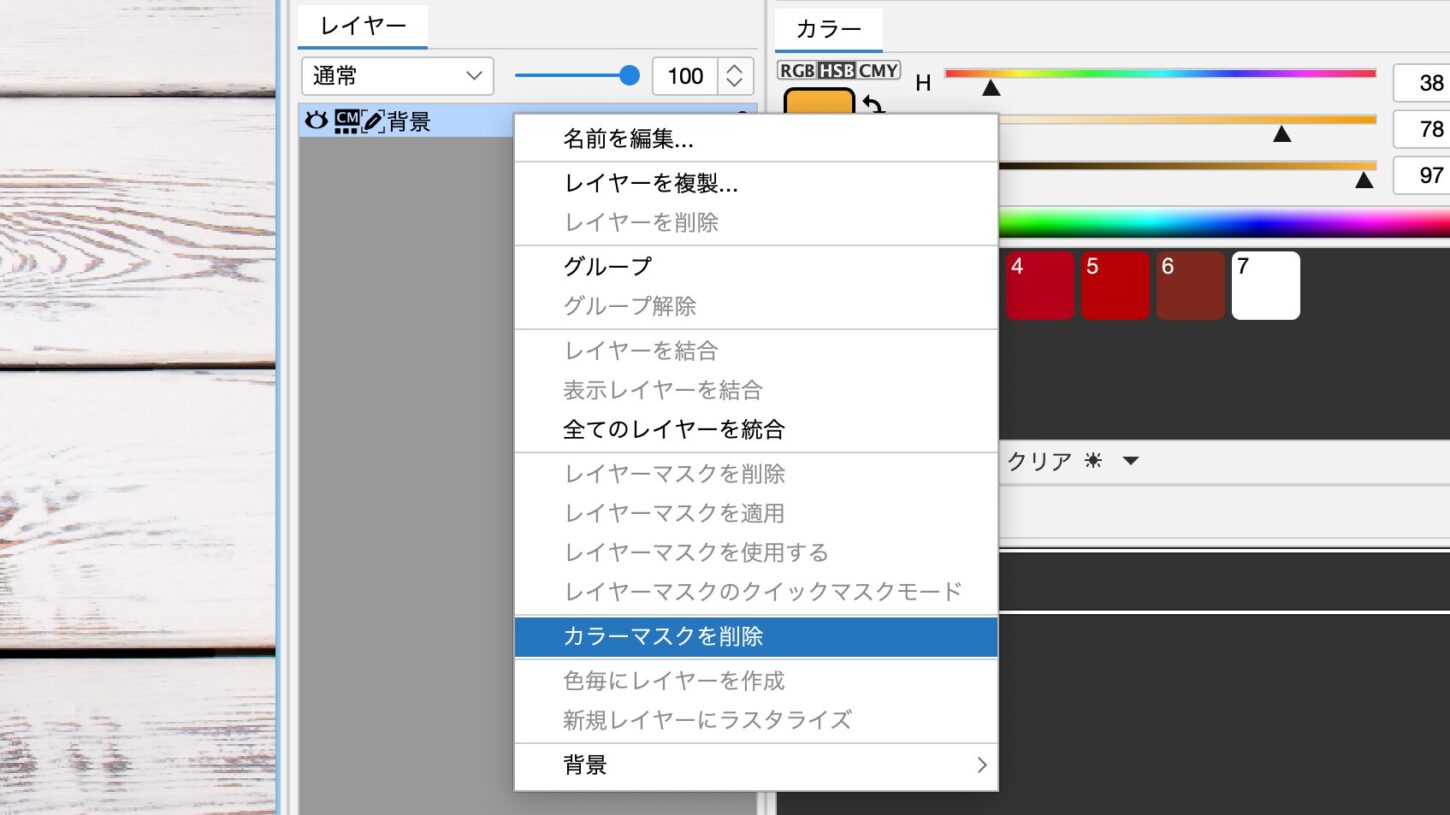 レイヤーを右クリック>カラーマスクを削除、または、レイヤーメニュー>カラーマスクを削除 を選択します。