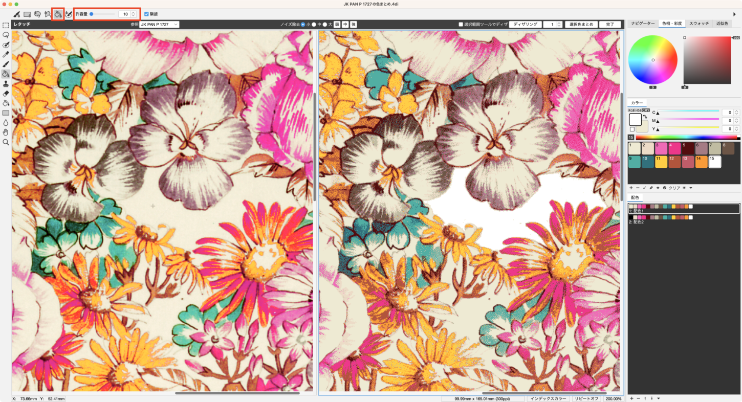 グランドと花の部分が地続きになっているデザイン(縁取りがないなど)の場合、レタッチ塗りつぶしツールでは意図しない箇所まで色が変更されてしまうことがあります。このような場合は、箇所ごとにブラシツールなどを手動で丁寧に塗り替える必要があります。