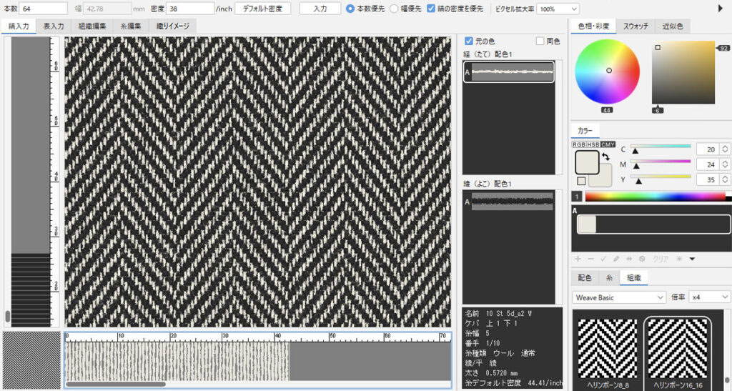 ベーシックなヘリンボーン柄は、経糸、緯糸1種類で表現します。 - 組織リストからヘリンボーン組織を選択します。