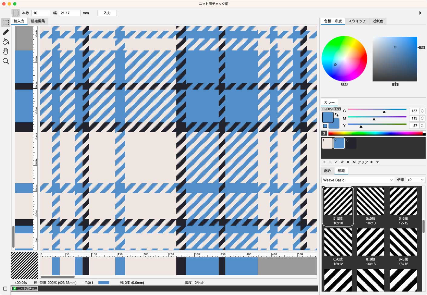 チェック機能でチェック柄を作成してからニットデータに書き出すと、組織柄のイメージにも簡単に対応できるようになります。ニット柄の作成方法として、ぜひヒントにしてみてください。
