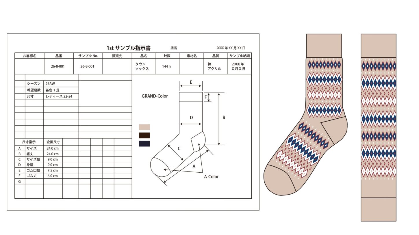 靴下の企画から製造までをスムーズに進めるために、デザイン画をモザイクデータに変換し、仕様書と合わせて工場に提供する効率的なフローをご紹介します。