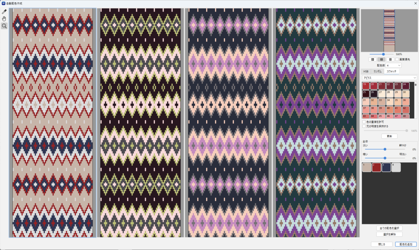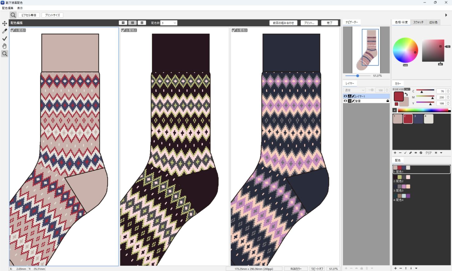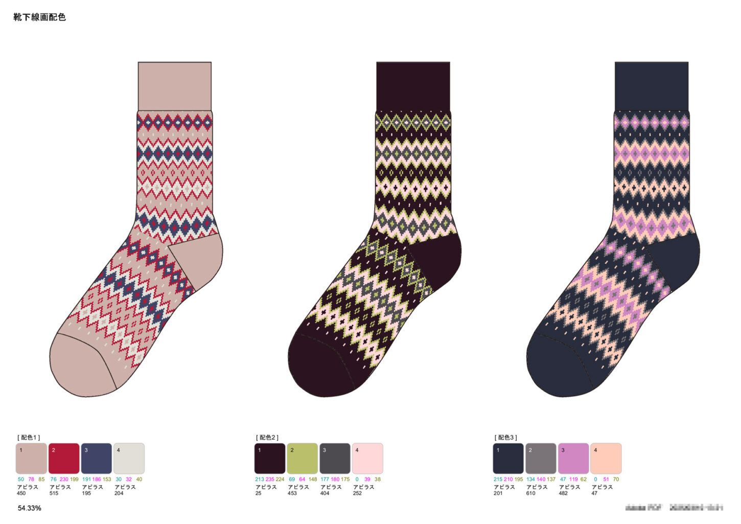 このモザイク機能を活用したデザインフローは、企画段階のイメージを正確に製造現場へ伝え、効率的な靴下作りを支援します。ぜひ、貴社のデザインワークフローに取り入れてみてください。