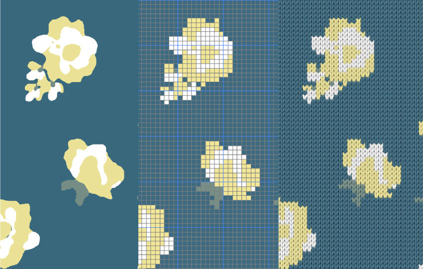 作業途中のモザイクデータからニットデータへの書き出しを行うことで、編み上げ後のイメージを早期に確認できます。
