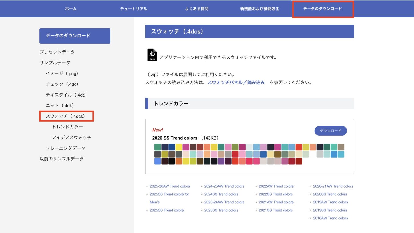 - ダウンロードしたいファイル名をクリックすると、スウォッチデータがダウンロードされます。