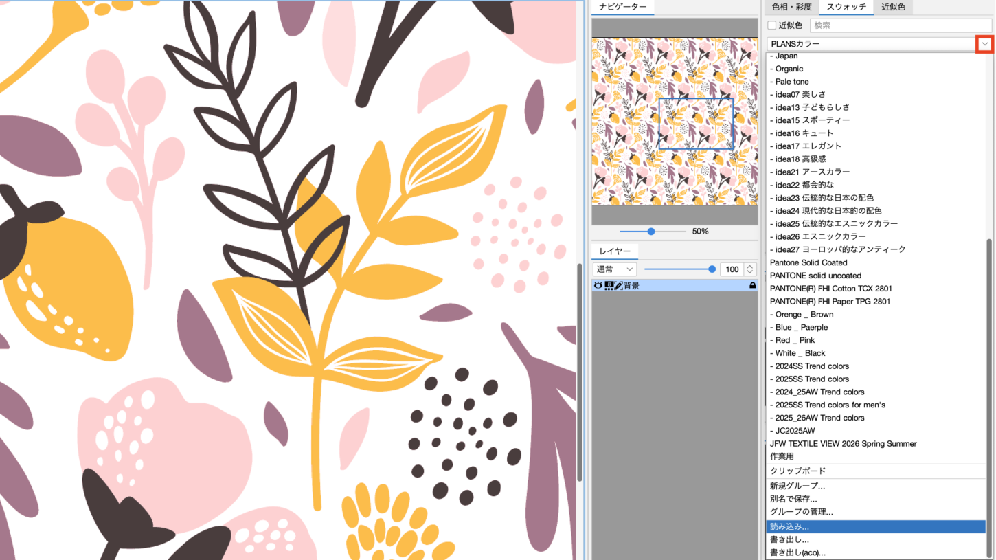選択したカラーデータがスウォッチパネルに表示されます。一度読み込んだデータは、「∨」プルダウンメニューに自動的に追加されるため、次回からはプルダウンメニューから直接選択できます。