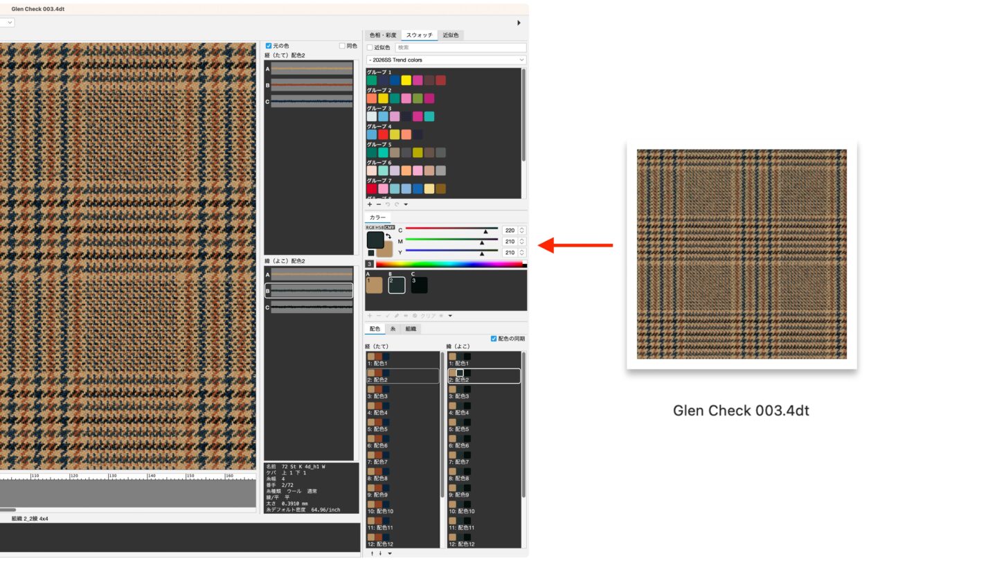 読み込んだスウォッチは、既存の色を置き換えたり、配色作成時のスウォッチとして活用したりすることで、トレンドカラーを取り入れたデザイン制作に役立ちます。