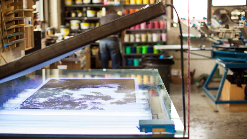 - 版を作る: デザインを露光した特別な乳剤をスクリーンに塗布し、デザイン部分だけがインクを通す穴になります。
